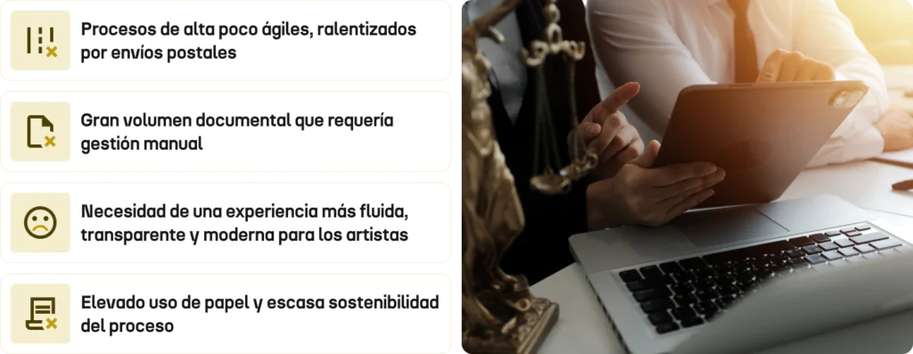 Antes de implantar Signaturit, AIE se enfrentaba a un proceso de incorporación de nuevos socios lento y dependiente del papel. La firma de contratos debía realizarse físicamente y enviarse a las oficinas, lo que afectaba especialmente a artistas en otras ciudades o países.