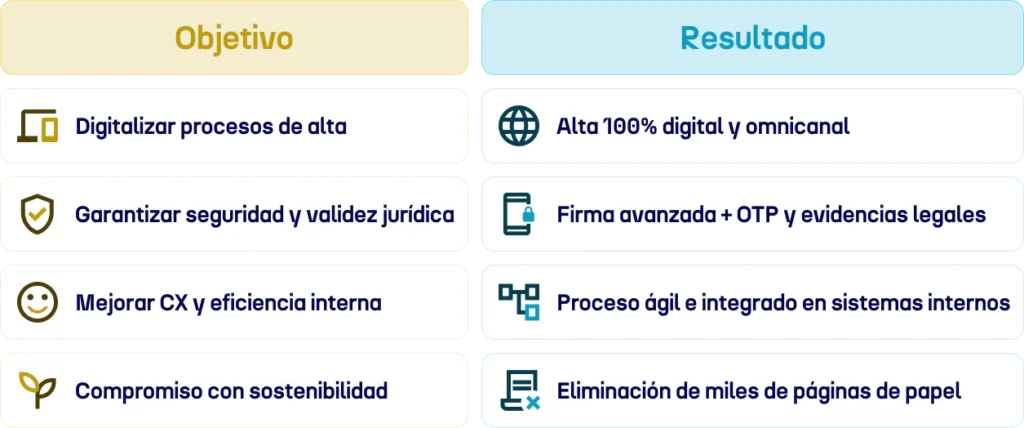 “Necesitábamos una firma digital integrada y orientada al cliente para asegurar un alta rápida y eficaz desde cualquier plataforma, garantizando la validación digital del cliente final”.