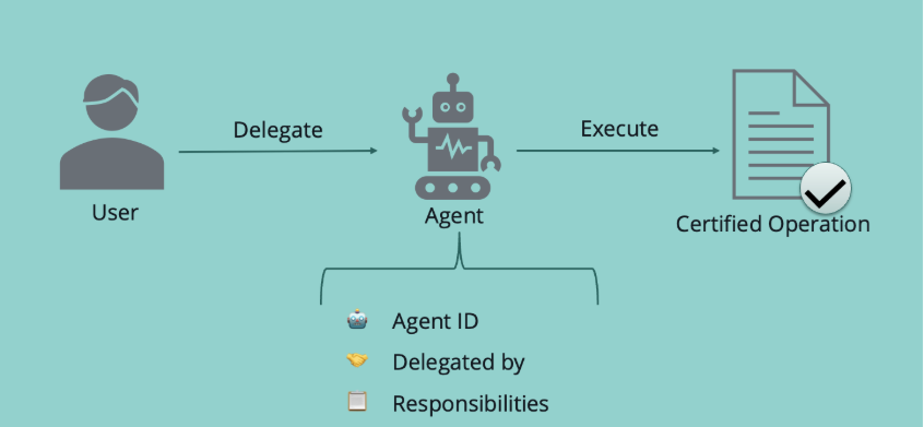 2. Délégation – L’utilisateur délègue explicitement son autorité à l’agent, créant ainsi l’équivalent numérique d’une procuration.