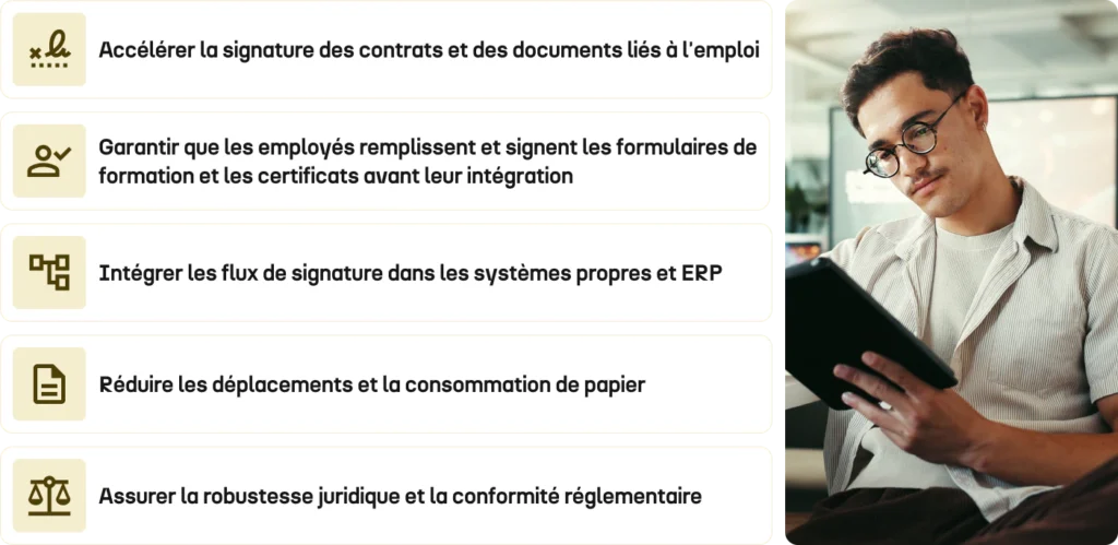 La numérisation des signatures permet d’accélérer les embauches, de garantir la conformité légale et d’améliorer l’expérience des employés.