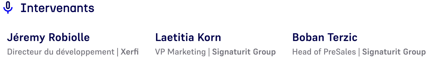 Nos experts présenteront également les solutions de confiance numérique de Signaturit Group : eSignature qualifiée, vérification d’identité (KYC/KYB), archivage probatoire, conformité eIDAS 2.0 et hébergement souverain, pour montrer comment lutter concrètement contre la fraude et tendre vers la confiance numérique !