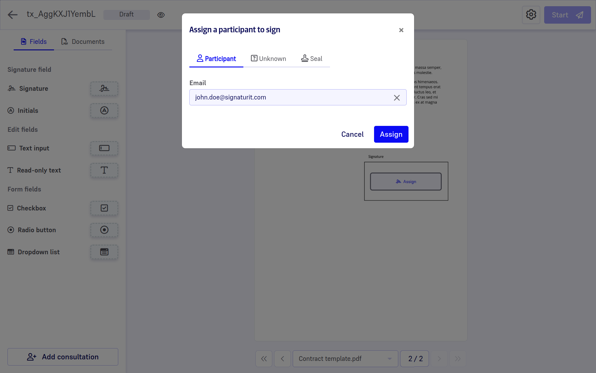 To get started, create an account on our platform. You may then start using our e-signature solution immediately for 14-days free trial. Note that the signer does not need to have a Universign Signaturit account.